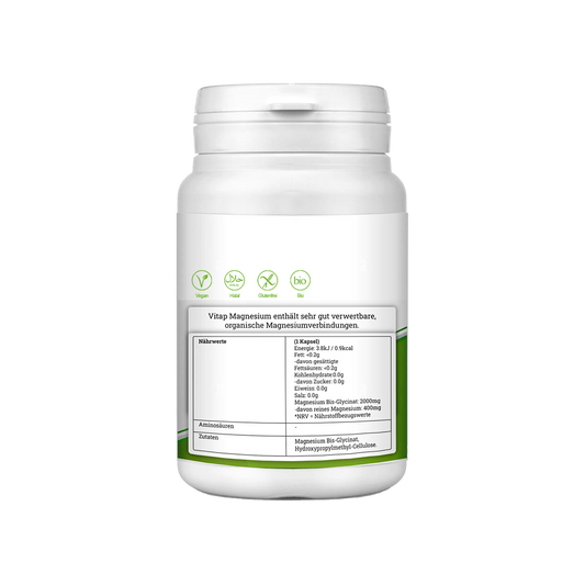 - Magnesium Bisglycinat: trägt zu normaler Muskelfunktion und Stressabbau bei